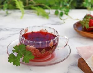 ローズヒップ、ハイビスカス、ブラックベリーリーフ、オレンジピール、ステビア、ストロベリー/香料が配合されていて、まるでいちご畑にいるような明るい気分にさせてくれるハーブティニコニコ